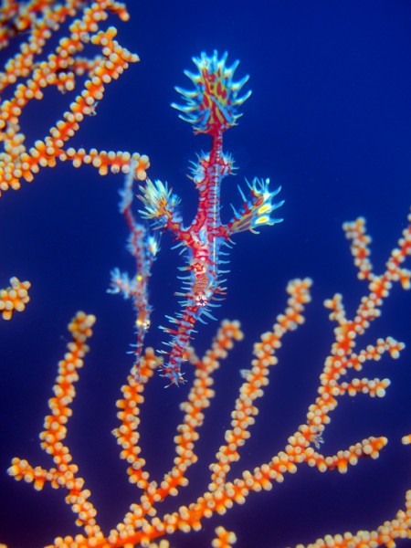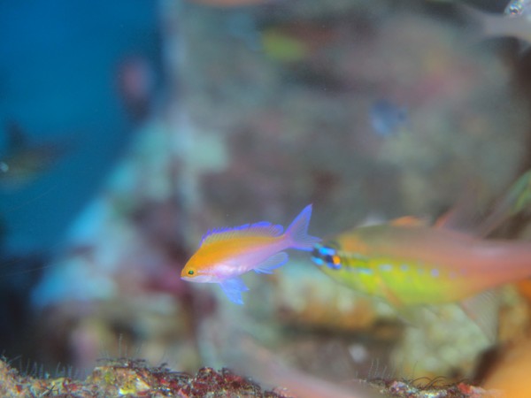 生き物はクマドリカエルアンコウ、オオモンカエルアンコウ、ベニカエルアンコウ、ハチジョウタツ、オオウミウマ、ニシキフウライウオ、カミソリウオ、ミジンベニハゼ、ネジリンボウ、ヒレナガネジリンボウ、フトスジイレズミハゼ、フタイロハナゴイ、ヒレグロスズメダイ、イチモンスズメダイ、フジタウミウシsp、フィコカリス・シムランス、ポントニデス・マルディブエンシス、ヨコシマエビ等の確認と情報がありました。