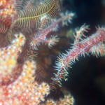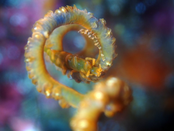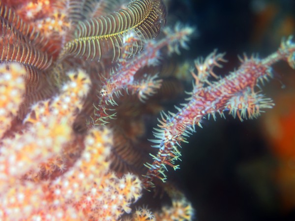 生き物はクマドリカエルアンコウ、オオモンカエルアンコウ、ニシキフウライウオ、カミソリウオ、テングノオトシゴ、ウミテング、ミジンベニハゼ、ネジリンボウ、ヒレナガネジリンボウ、ハタタテハゼ、ホタルビオニハゼ、ヒメオニハゼ、スミレナガハナダイ、ベニハナダイ、クダゴンベ、ヤマドリ、ミヤケテグリ、チンアナゴ、ニゲミズチンアナゴ、タテジマヤッコ、ニセゴイシウツボ、サビウツボ、クロスジリュウグウウミウシ、ミアミラウミウシ、オドリカクレエビ、ビシャモンエビ、キサンゴカクレエビ、キミシグレカクレエビ、フィコカリス・シムランス、イソコンペイトウガニ等の確認と情報がありました。