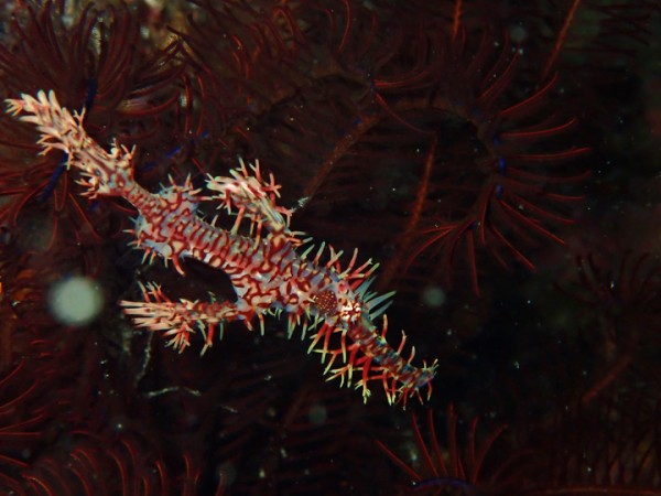 生き物はクマドリカエルアンコウ、オオモンカエルアンコウ、ニシキフウライウオ、カミソリウオ、カミソリウオsp、ハチジョウタツ、ウミテング、テングノオトシゴ、ネジリンボウ、ヒレナガネジリンボウ、アカハチハゼ、チンアナゴ、センネンダイ幼魚、ウミウシカクレエビオドリカクレエビ、キミシグレカクレエビ、フィコカリス・シムランス等の確認と情報がありました。