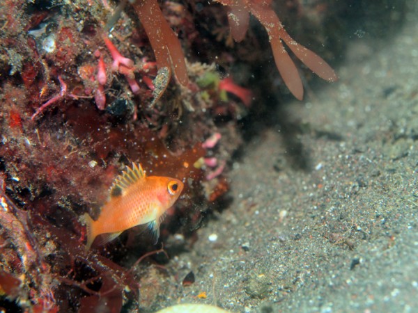 生き物はオオモンカエルアンコウ、イロカエルアンコウ、ベニカエルアンコウ、カエルアンコウ、ハナオコゼ、ハチジョウタツ、ウミテング、クダゴンベ、ミジンベニハゼ、ミホノハゴロモハゼ、スミツキハナダイ、ヒメハナダイ、デイゴハナダイ、フタイロハナゴイ、オガサワラカサゴ、ヒレナガカサゴ、アマミスズメダイ、ニゲミズチンアナゴ、インドアカタチ、ジョーフィッシュsp、ツノザヤウミウシ、カンナツノザヤウミウシ、ウデフリツノザヤウミウシ、ホムライロウミウシ、ボブサンウミウシ、トガリモエビ、テヅルモヅルエビ、フィコカリス・シムランス等の確認と情報がありました。