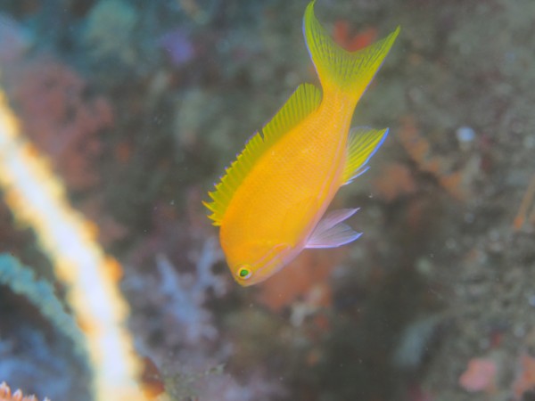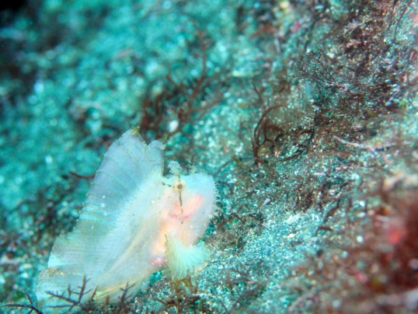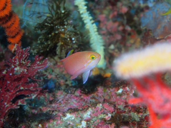 生き物はオオモンカエルアンコウ、イロカエルアンコウ、ベニカエルアンコウ、カエルアンコウ、ハチジョウタツ、ウミテング、タカクラタツ、ミジンベニハゼ、ネジリンボウ、キザクラハゼ、スジクロユリハゼ、ミホノハゴロモハゼ、ハダカハオコゼ、ヒレナガカサゴ、オガサワラカサゴ、スミレナガハナダイ、ベニハナダイ、ヒメハナダイ、スミツキハナダイ、フタイロハナゴイ、ムラモミジハナダイ、セナキルリスズメダイ、スミツキアカタチ、インドアカタチ、ニゲミズチンアナゴ、ショーフィッシュsp、ツノザヤウミウシ、カンナツノザヤウミウシ、トガリモエビ、ヨコシマエビ等の確認と情報がありました。