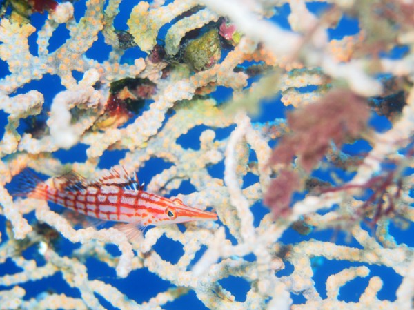 生き物はオオモンカエルアンコウ、イロカエルアンコウ、ベニカエルアンコウ、カエルアンコウ、ハチジョウタツ、ウミテング、ダイダイヨウジ、ミジンベニハゼ、ミホノハゴロモハゼ、フタイロハナゴイ、スミレナガハナダイ、デイゴハナダイ、ムラモミジハナダイ、ヒメハナダイ、オガサワラカサゴ、ヒレナガカサゴ、ニゲミズチンアナゴ、インドアカタチ、ツノザヤウミウシ、カンナツノザヤウミウシ、ウデフリツノザヤウミウシ、カリヤウミウシ、ミアミラウミウシ、ボブサンウミウシ、クサモチアメフラシ、トガリモエビ、ラオメネス・コルヌトゥス等の確認と情報がありました。
