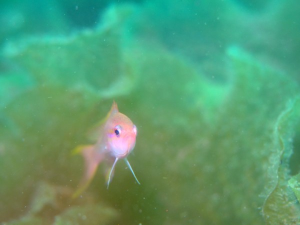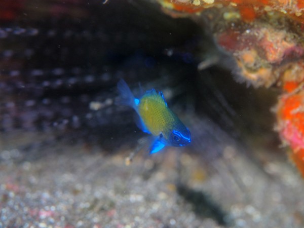 生き物はオオモンカエルアンコウ、イロカエルアンコウ、ベニカエルアンコウ、カエルアンコウ、ハチジョウタツ、オオウミウマ、ウミテング、ヒレナガネジリンボウ、ネジリンボウ、ミホノハゴロモハゼ、キザクラハゼ、ナノハナフブキハゼ、ヒレナガカサゴ、ハダカハオコゼ、クダゴンベ、ヒメハナダイ、ベニハナダイ、アマミスズメダイ、インドアカタチ、ニゲミズチンアナゴ、ツノザヤウミウシ、ウデフリツノザヤウミウシ、ボブサンウミウシ、トガリモエビ、エボシカクレエビsp、キサンゴカクレエビ、ヨコシマエビ、ゼブラガニ、イソコンペイトウガニ等の確認と情報がありました。
