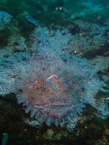 こんにちは、まいです!今日の天気は曇り時々晴れ。風は南西の風がやや吹き、外海はややパシャついていましたが、全ポイント潜水可能としました。水温は16~17℃、透視度は8~12mと良好です。今日は先端でキアンコウが見られたようです。