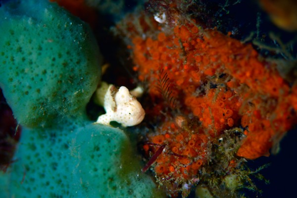 生物はクマドリカエルアンコウ、オオモンカエルアンコウ、ヒレナガネジリンボウ、ネジリンボウ、ミジンベニハゼ、ホタルビオニハゼ、ニシキフウライウオ、カミソリウオ、テングノオトシゴ、ハチジョウタツ、オオウミウマ、タカクラタツ、ニゲミズチンアナゴ、チンアナゴ、カンナツノザヤウミウシ、ゴマフビロードウミウシ、サガミリュウグウウミウシ、クロスジリュウグウウミウシ、トサカリュウグウウミウシ、エボシカクレエビ、フィコカリス・シムランス、アヤトリカクレエビ、トサカクレエビ、ウミウシカクレエビ等確認と情報がありました。